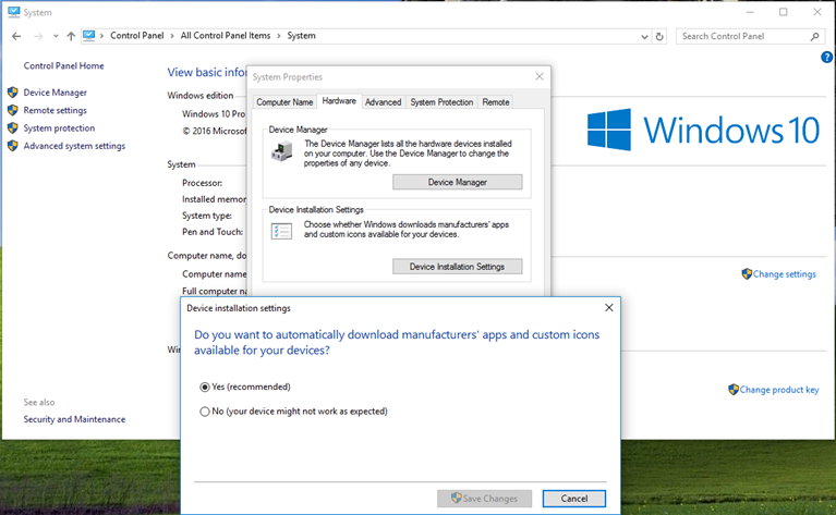 - It will be necessary to turn off Automatic Hardware Updates. To do this, open Control Panel, then select System Settings. Click Advanced System Settings. Choose the Hardware tab. Click Device Installation Settings. Select "NO"